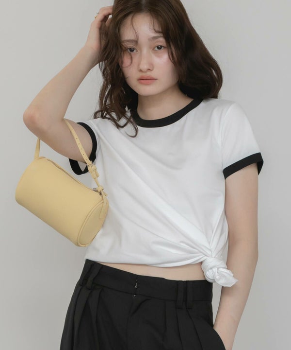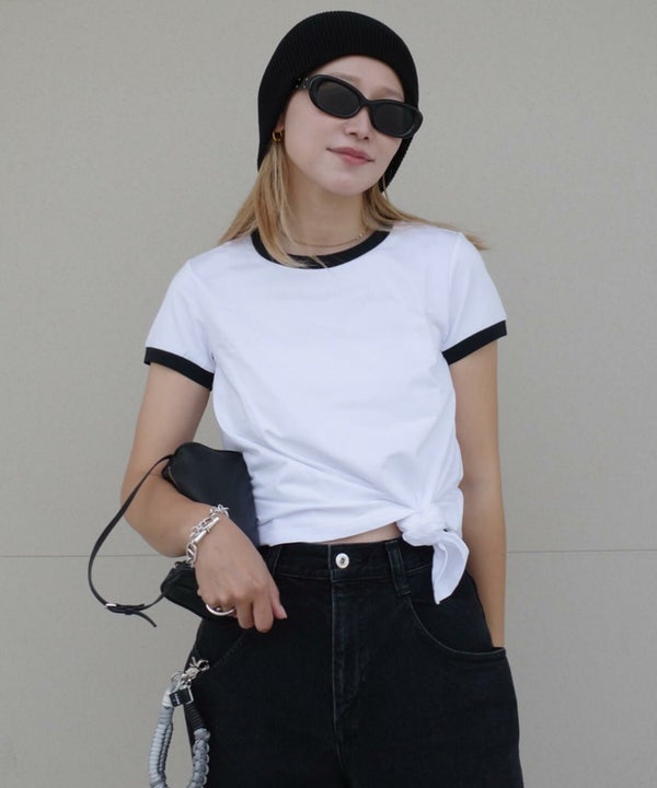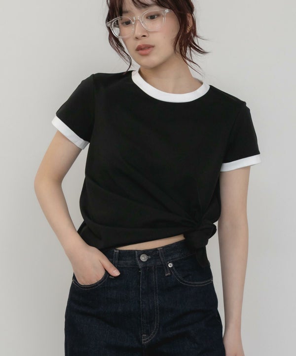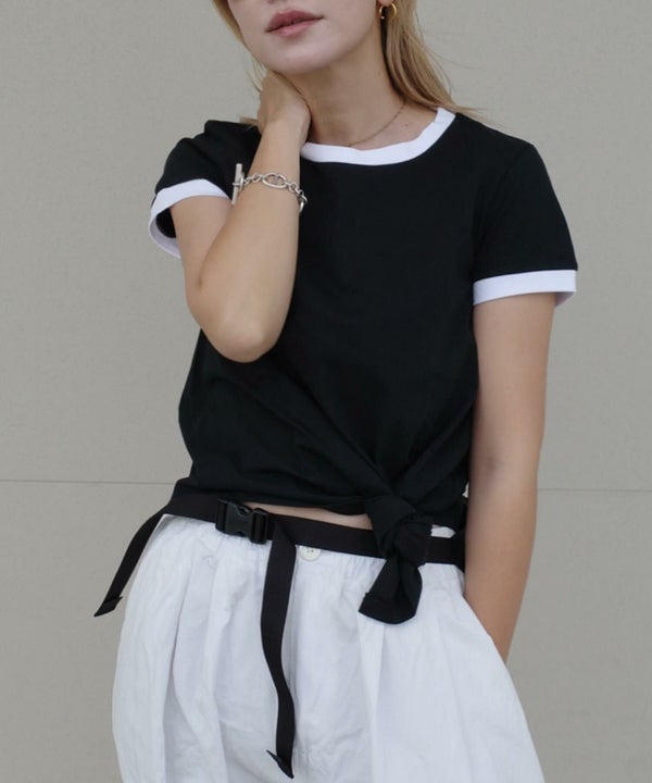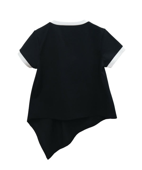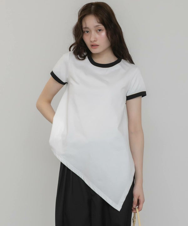 フロントのカッティングが印象的なアシンメトリーデザインがポイントのリンガーTシャツ。