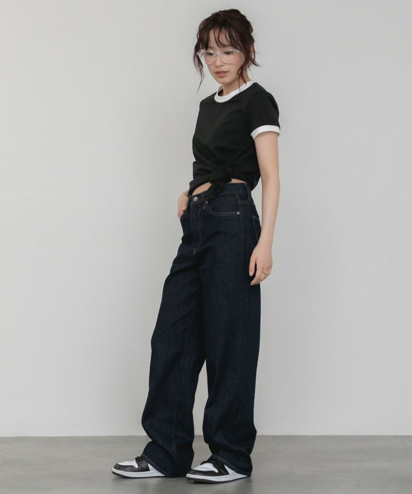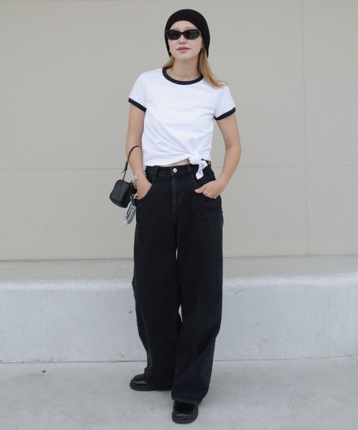裾をラフに結んで肌見せアレンジを加えると、スタイリングに動きとリズムが生まれます。