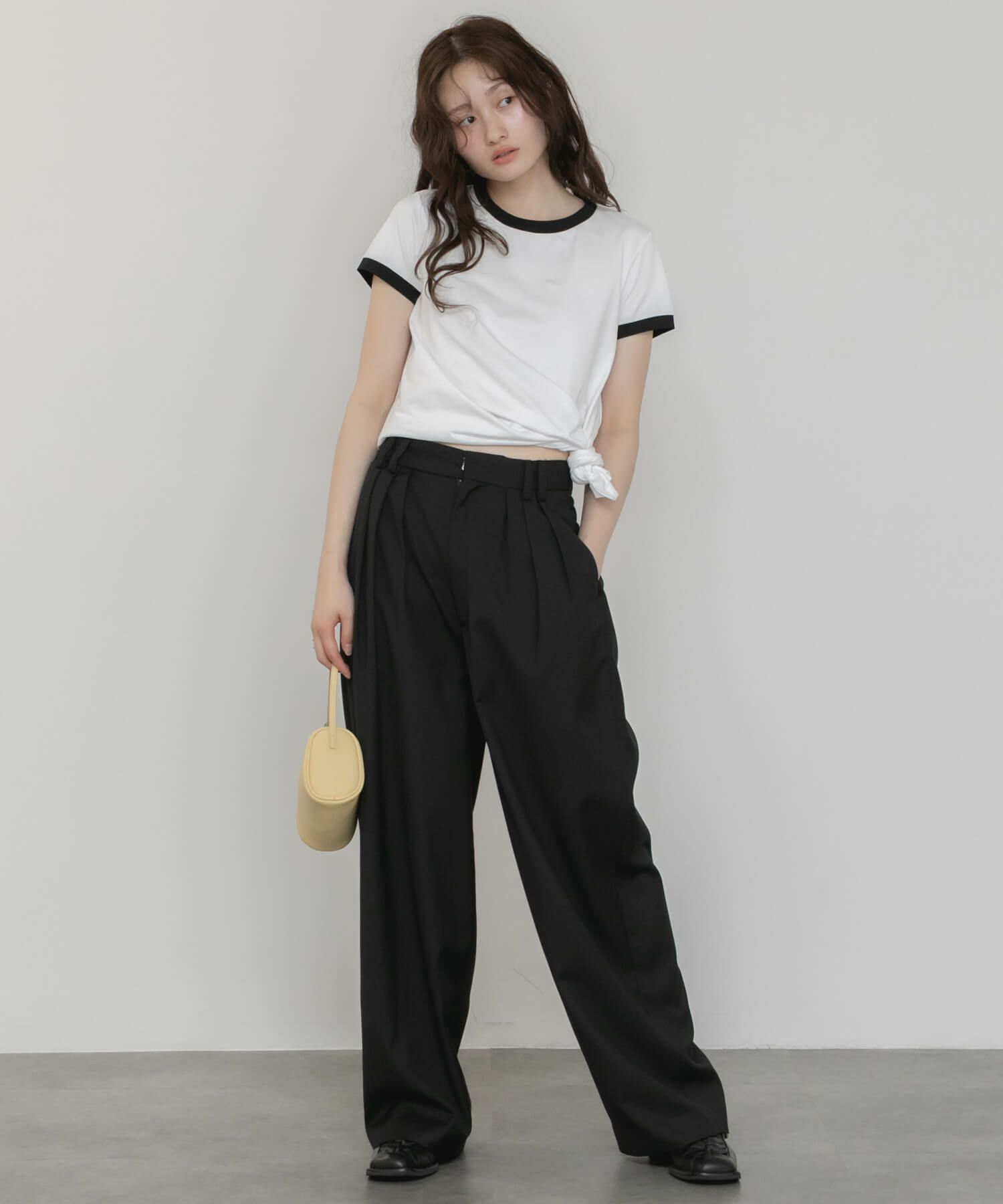 トップスのコンパクトなフォルムと裾のデザインが引き立ち、