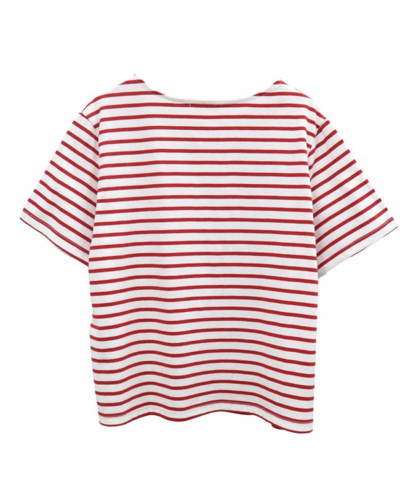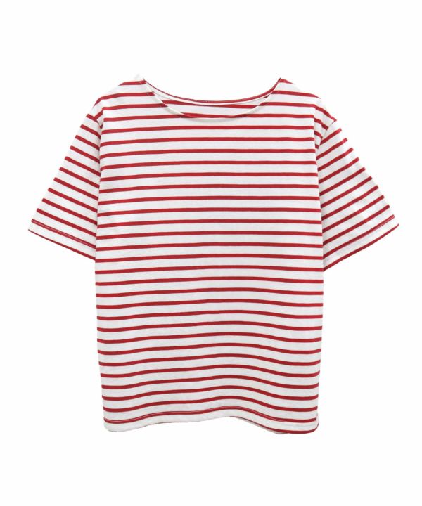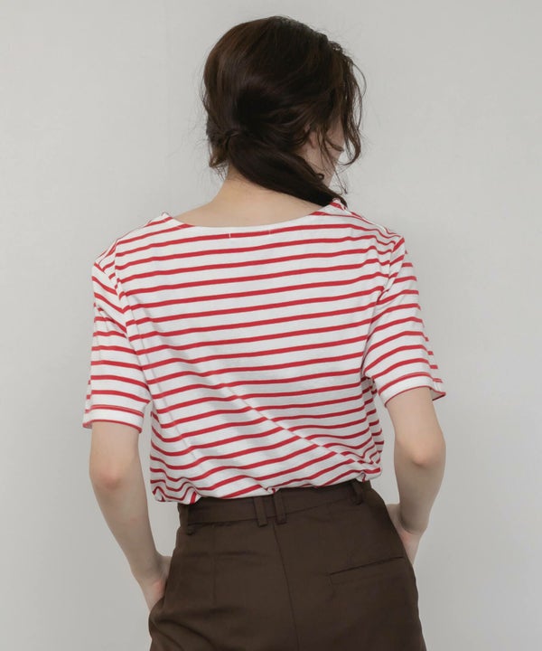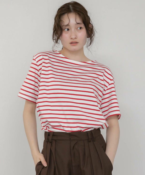 レッドのボーダーには、チョコブラウンのタックパンツやジャンパースカートを合わせると、