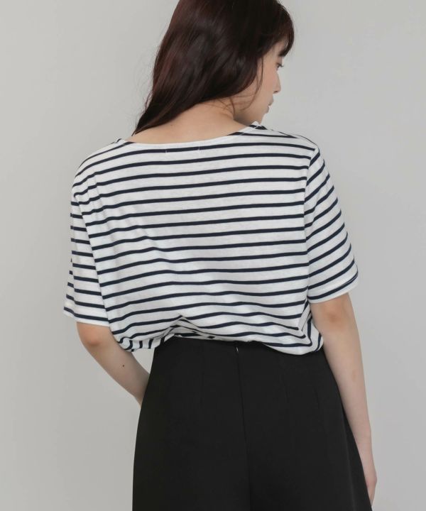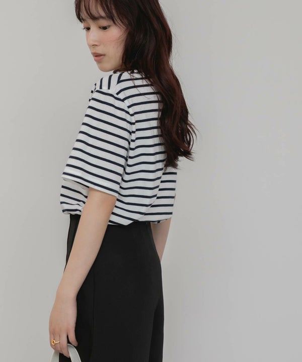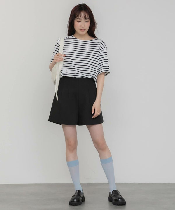 ネイビーのボーダーは、ブラックのショートパンツとローファーでまとめるとミニマルなコーデに仕上がります。