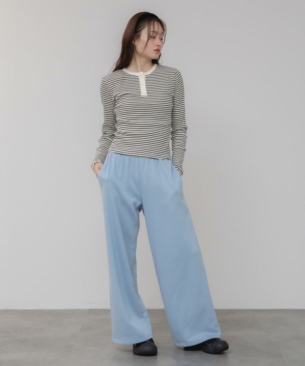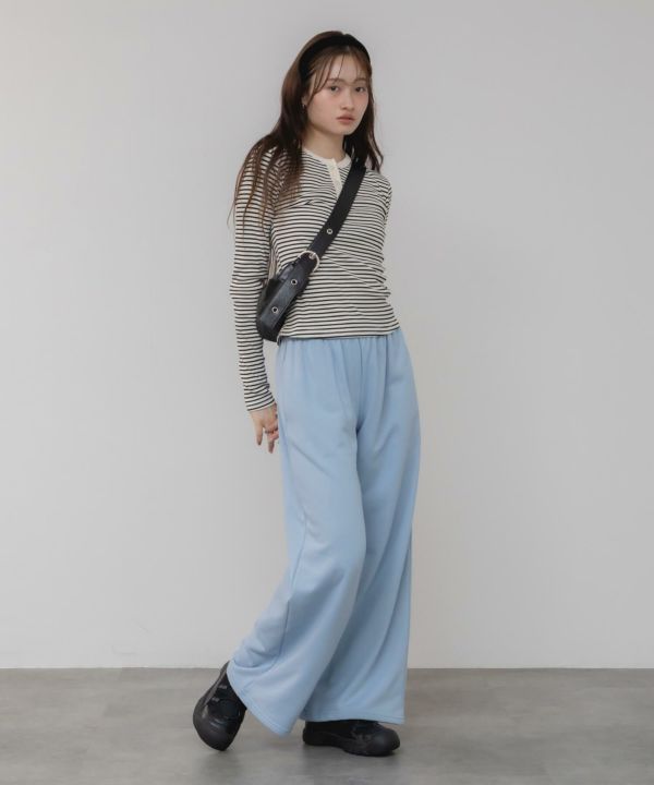 ヘンリーネックの配色がコーデの程よいポイントに。