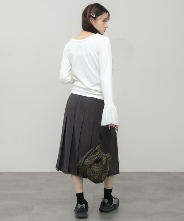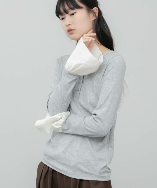 ベースはシンプルなヘンリーネックに、袖口だけ異素材のフリルを効かせたデザイン。