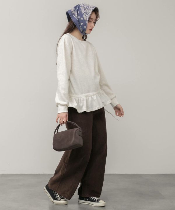 デニムやボリュームのあるパンツと合わせてラフに着ると、オフショルとペプラムの立体感が程よく引き立ち、スウェットでも単調にならないバランスに仕上がります。
