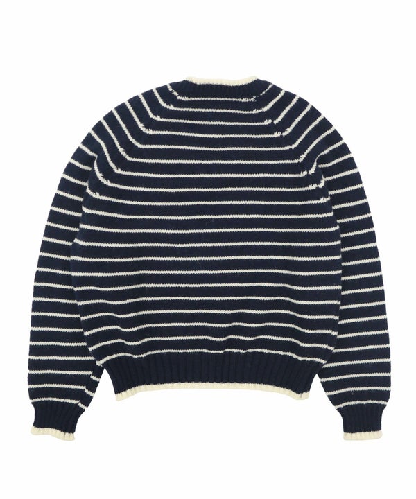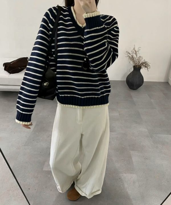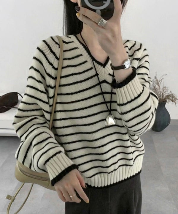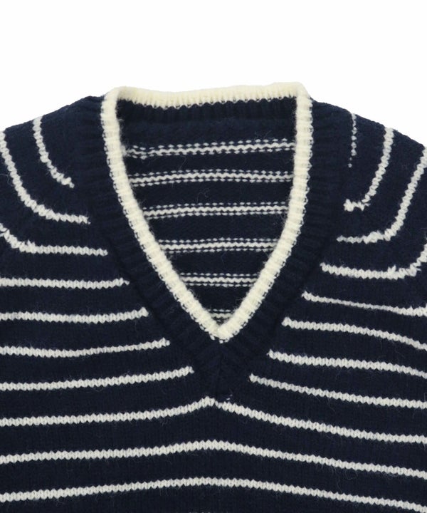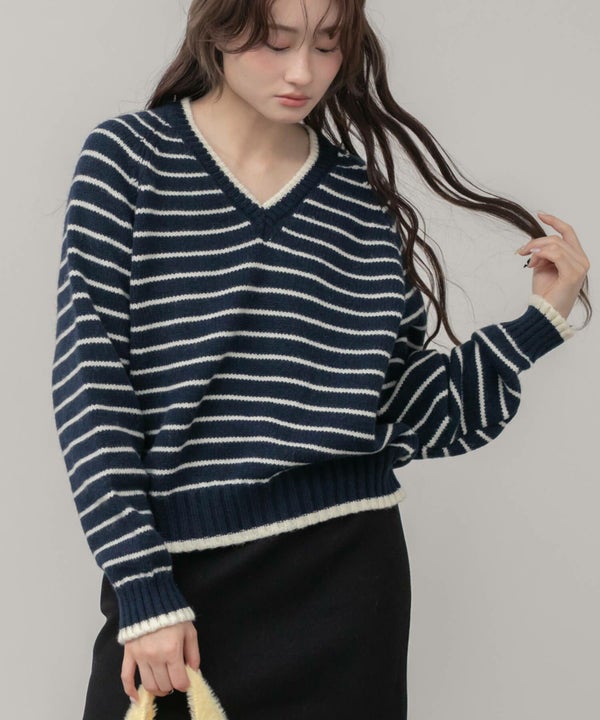ほどよく開いたVネックとベーシックなボーダー柄を組み合わせたニットトップス。