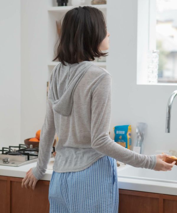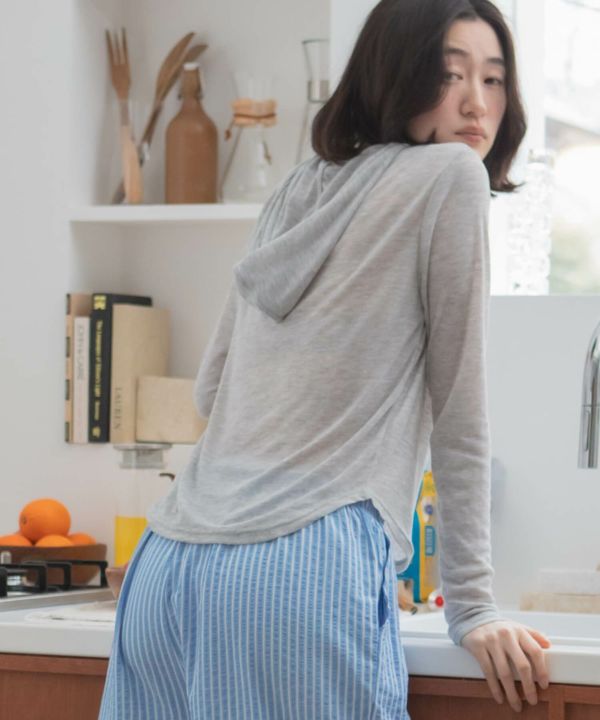 フーディー仕様で程よくカジュアルダウンしながらも、 シアー素材ならではの軽やかさで重たく見えません。
