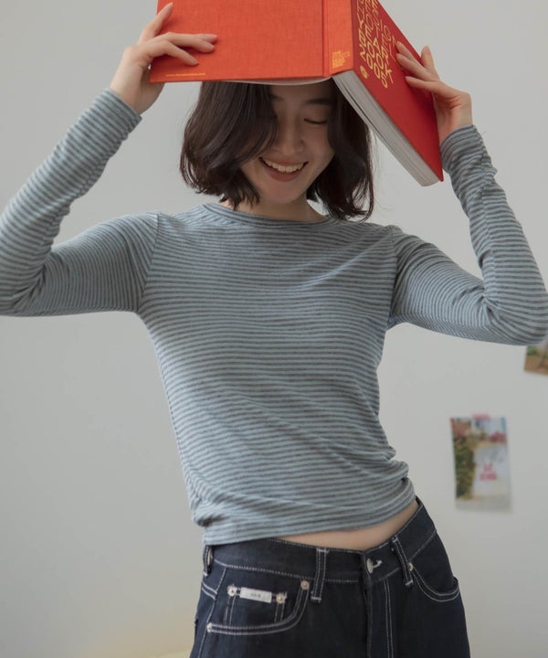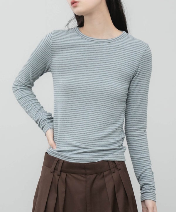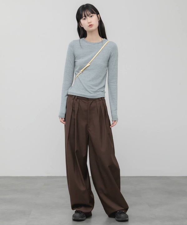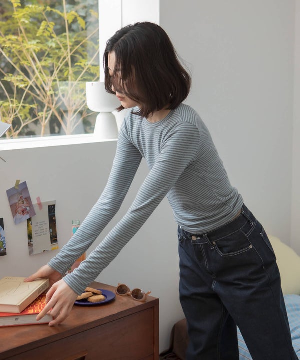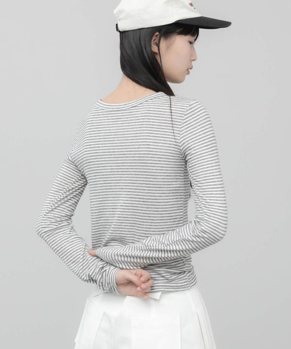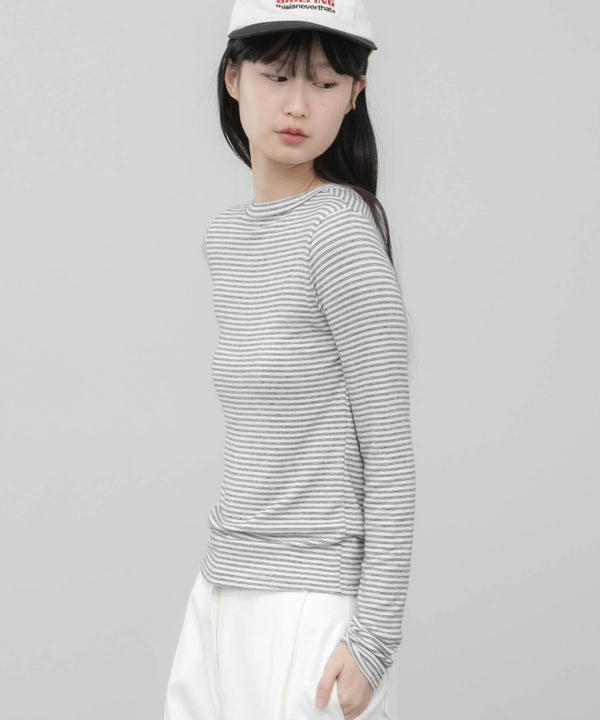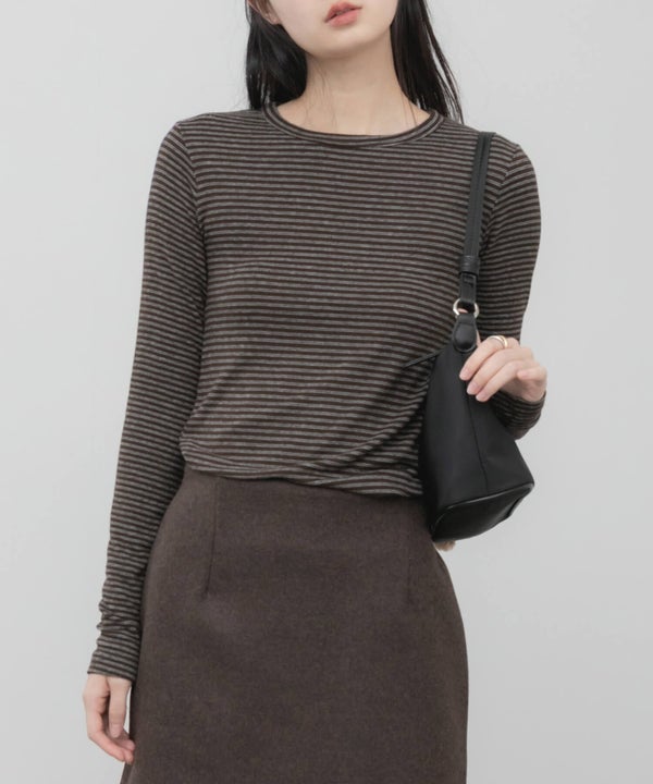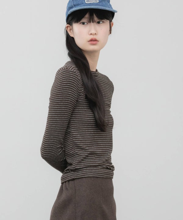 細ピッチのボーダーが主張しすぎず、スタイリングに自然と溶け込むコンパクトロンT。