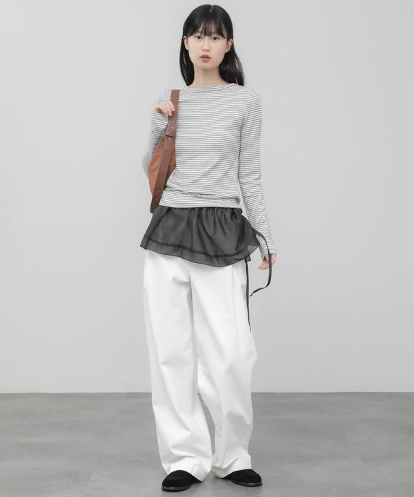 シャツやスウェット、カーディガンのインナーとして取り入れればボーダーがさりげないアクセントになり、レイヤードスタイルに奥行きをプラスします。