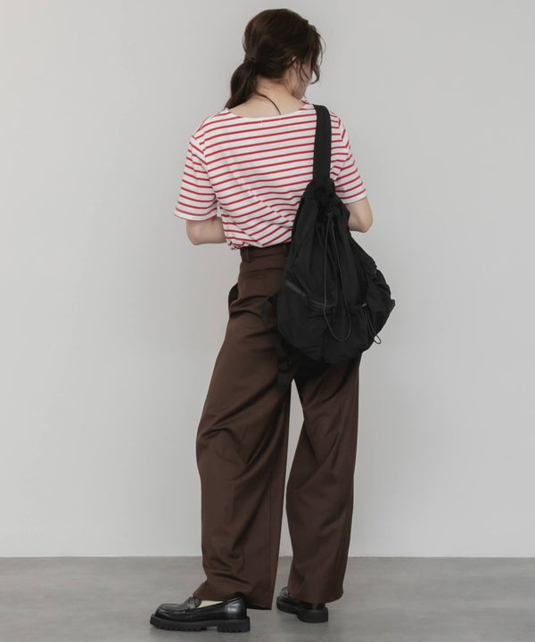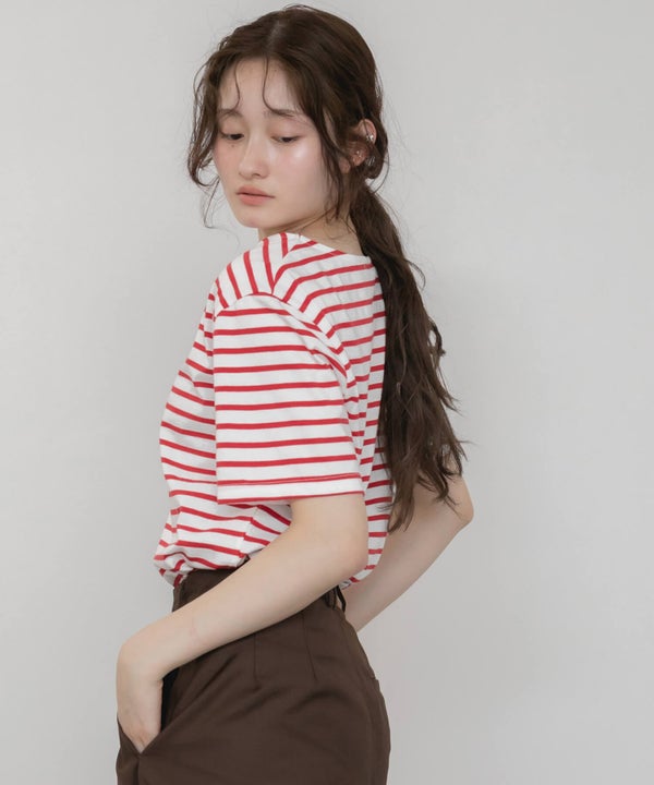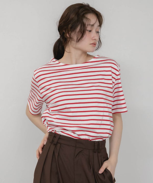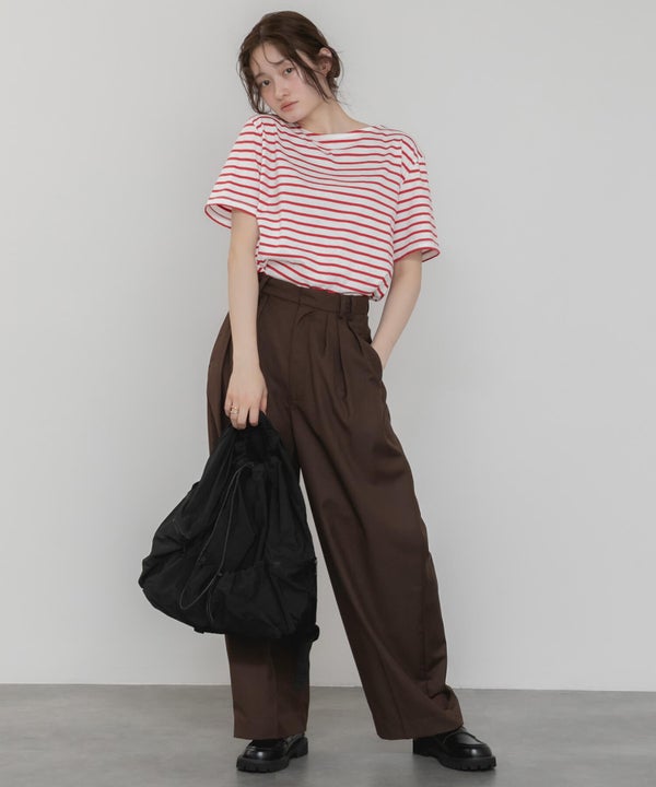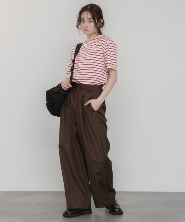 レッドのボーダーには、チョコブラウンのタックパンツやジャンパースカートを合わせると、
