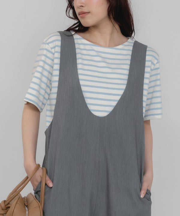 ライトブルーは、グレーのオーバーオールやカーゴパンツと合わせて、