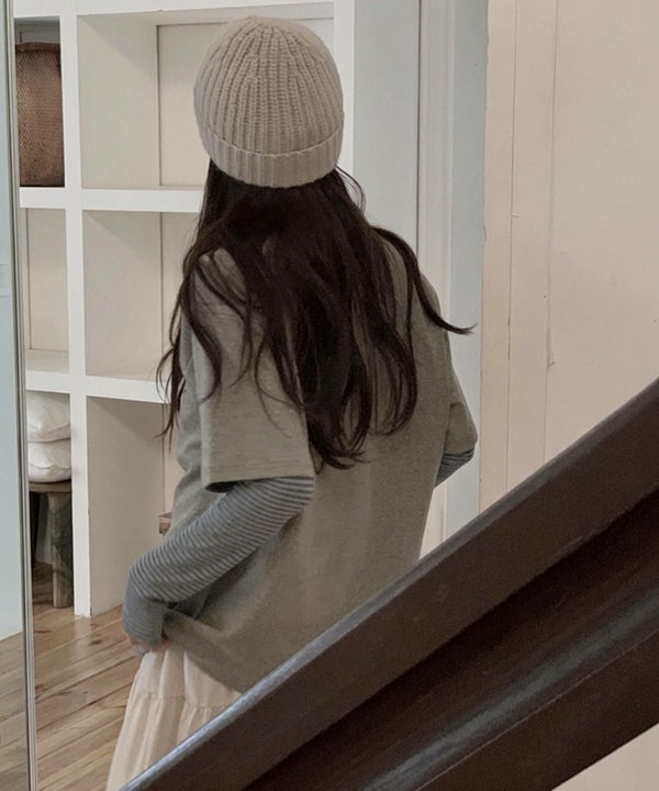 首元は詰まりすぎないクルーネックで、カーディガンやシャツを重ねた際も抜けのある印象に。