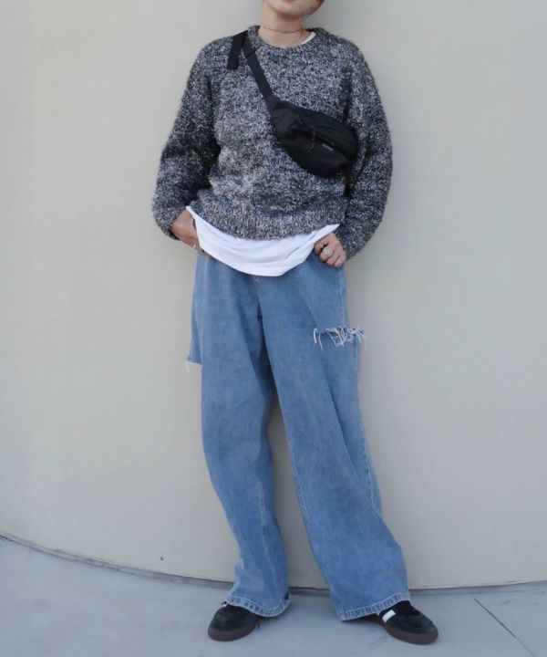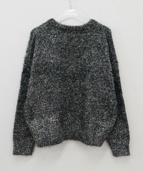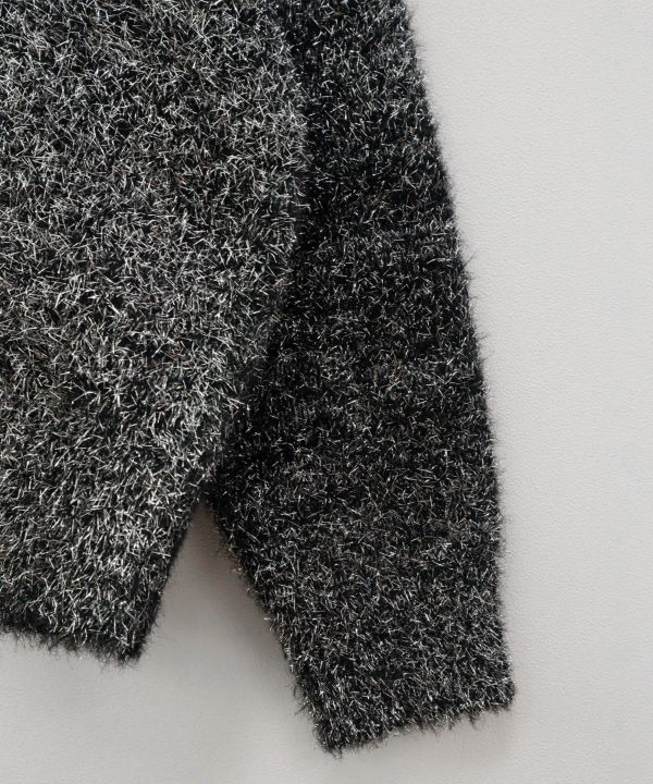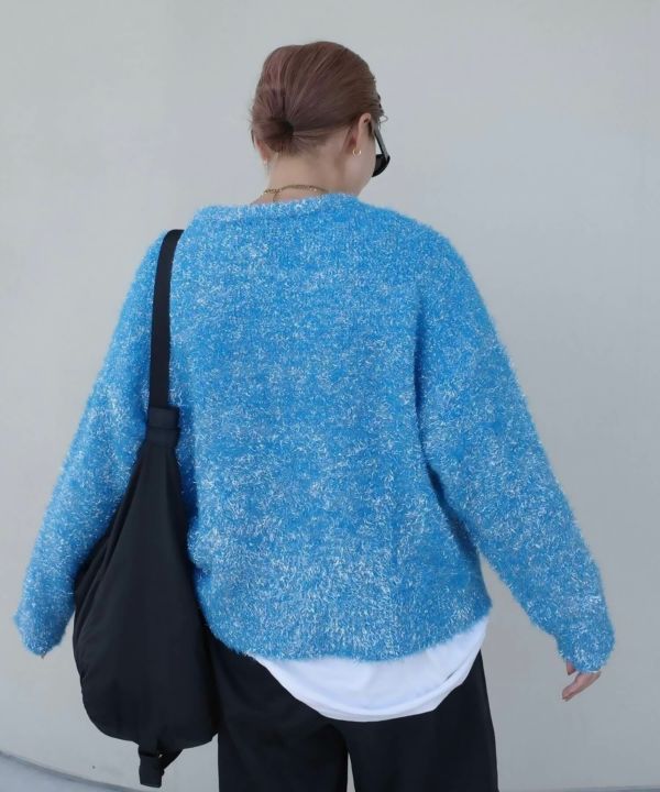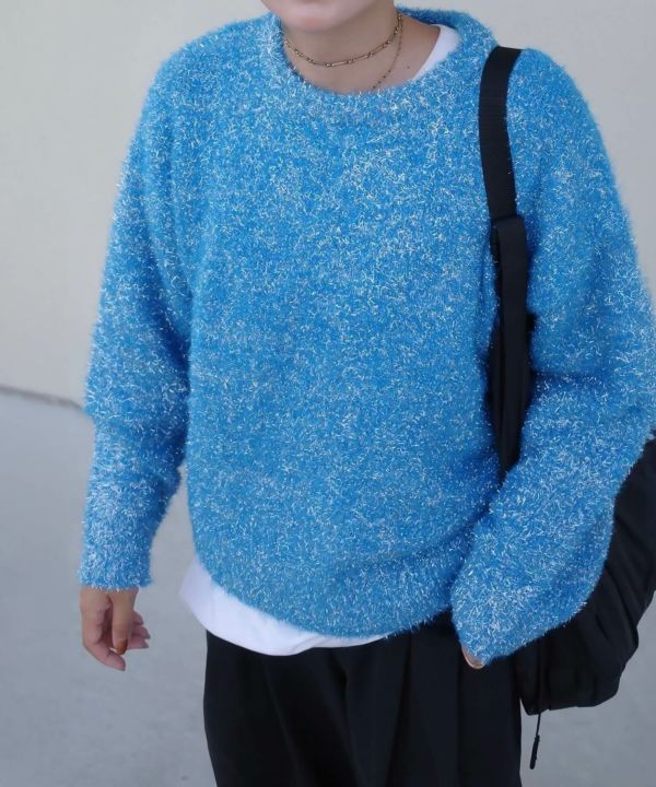 ふんわりとしたフェザーニットとラメの組み合わせが、トレンド感を後押しします。