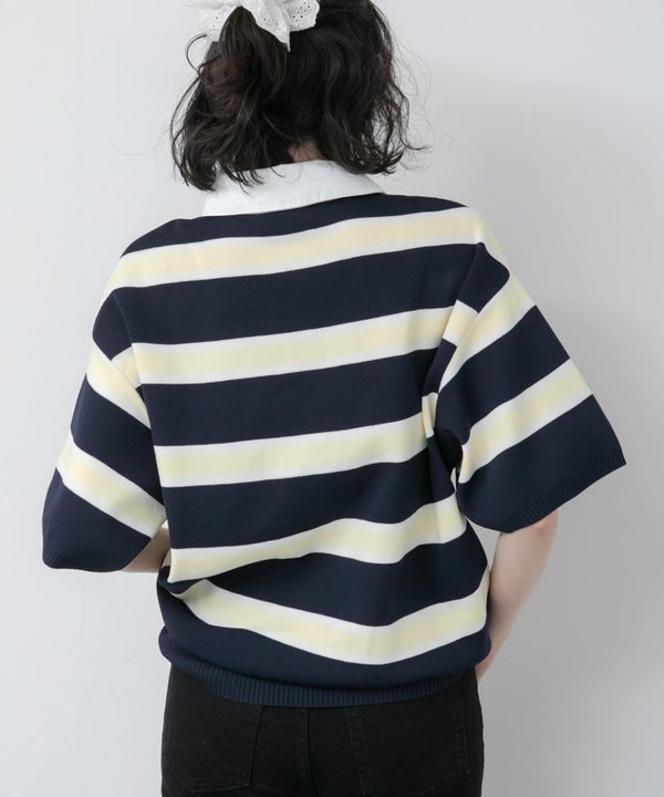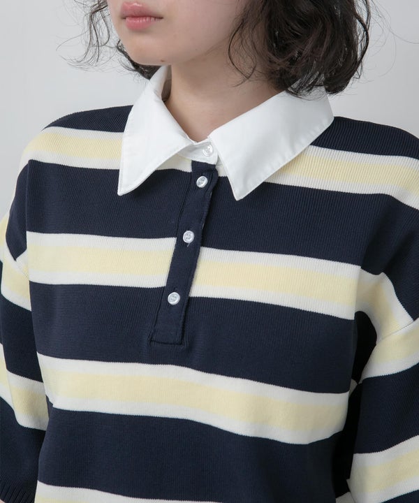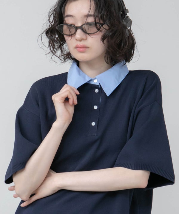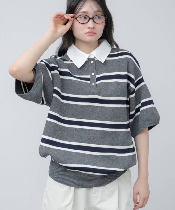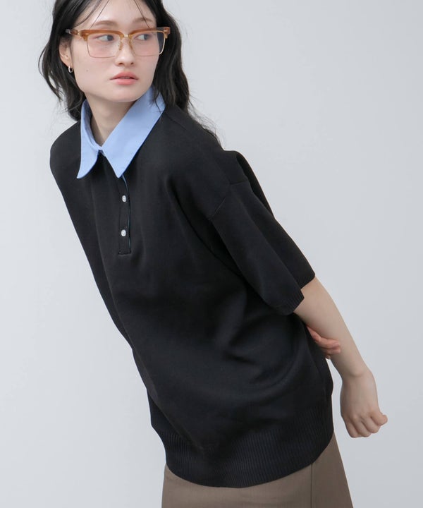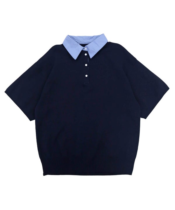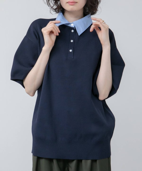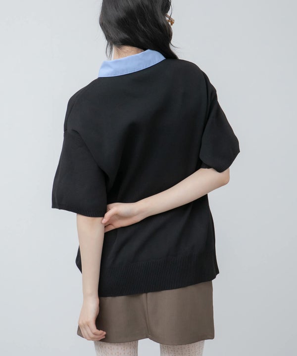 シャツ襟をドッキングした、レイヤード風デザインのニットトップス。