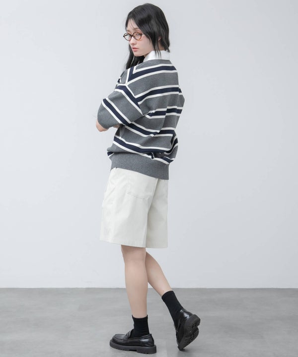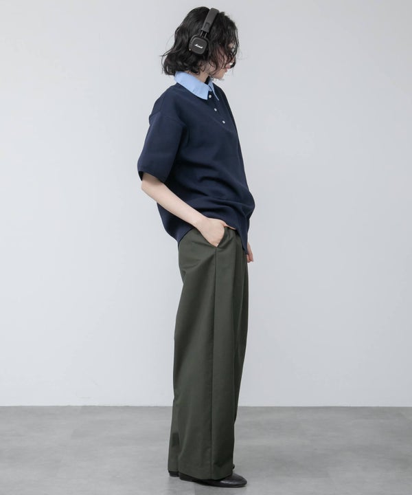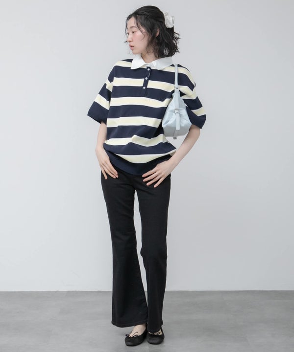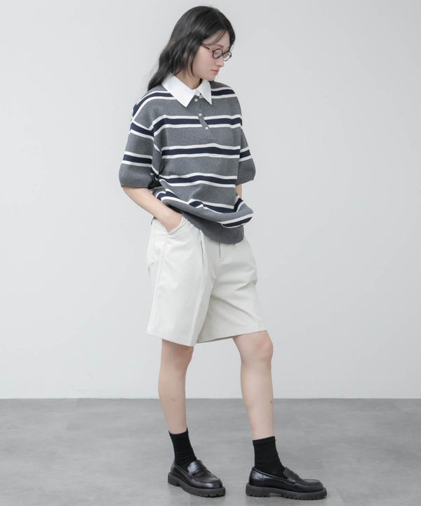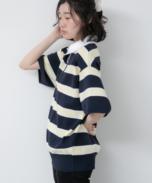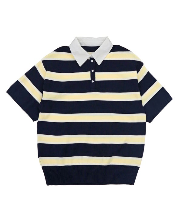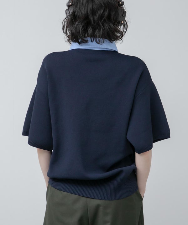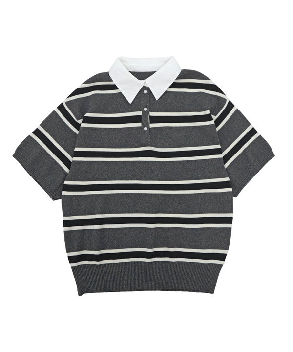 シャツ襟をドッキングした、レイヤード風デザインのニットトップス。