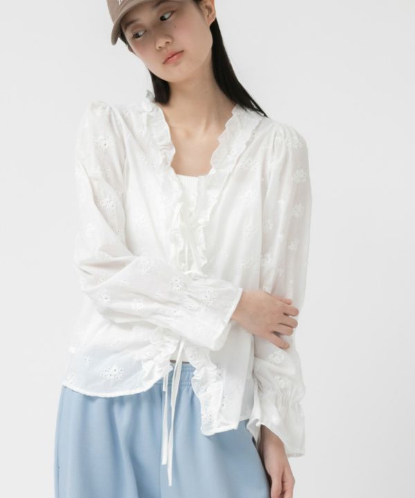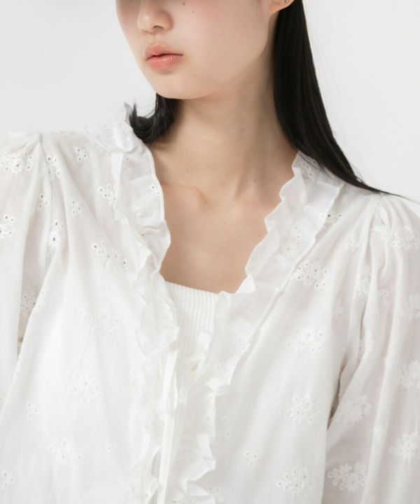 繊細なフラワーレース刺繍が施された、ヴィンテージ感のあるブラウス。