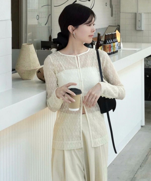 ベーシックなキャミソールに重ねるだけで、レディライクなスタイリングが完成。