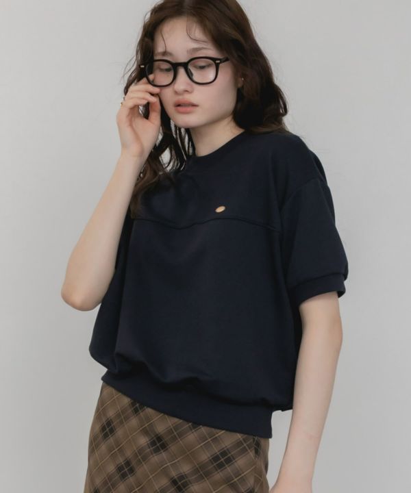 胸元に切り替えを入れたミニマルなデザインに、さりげなく光るゴールドプレートがアクセント。