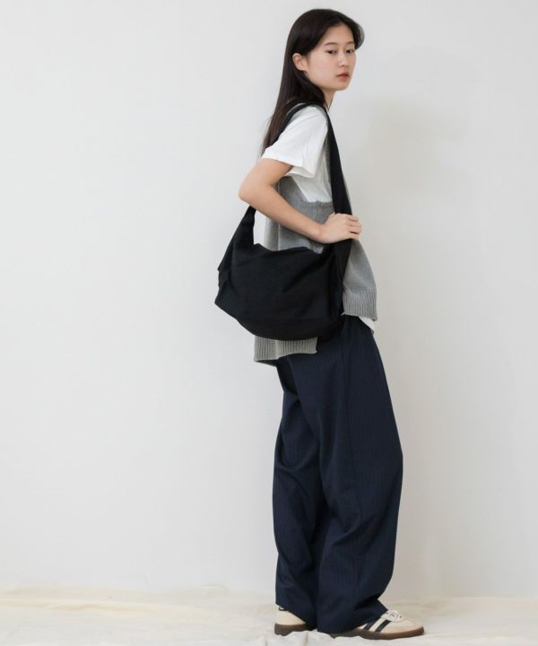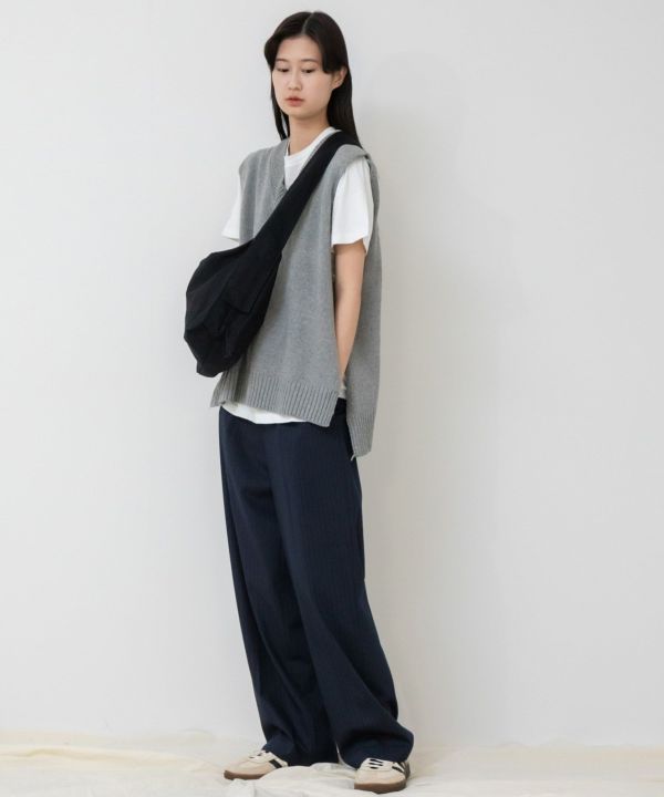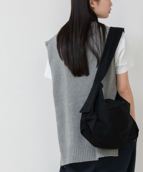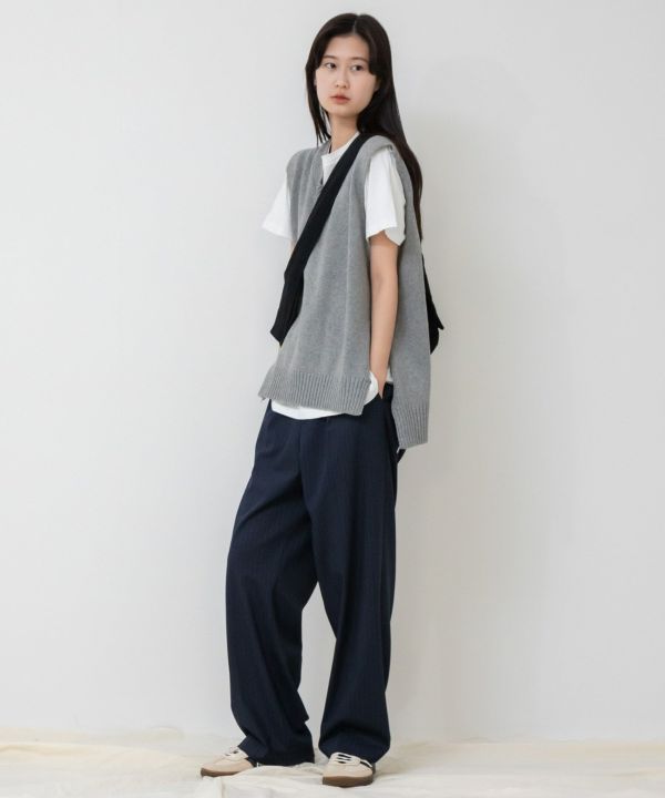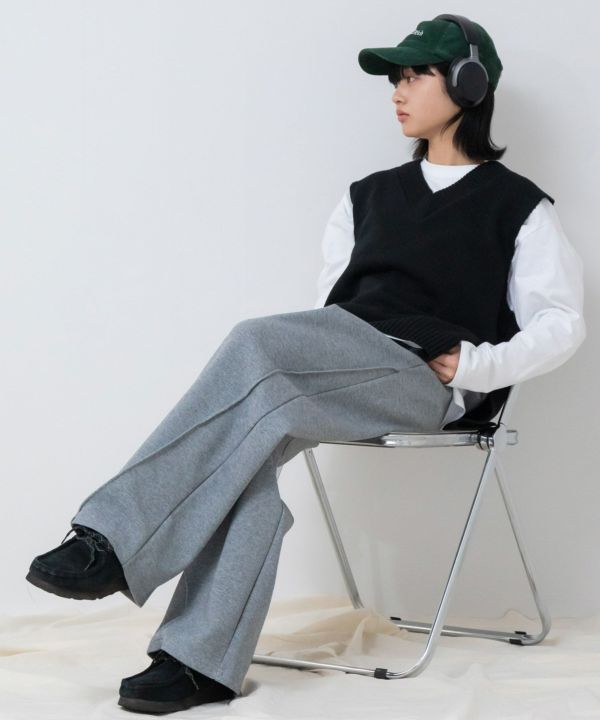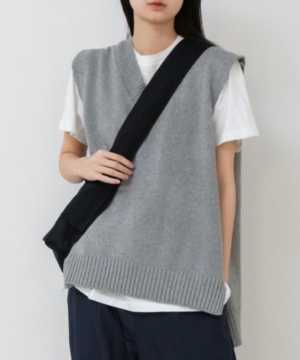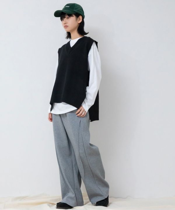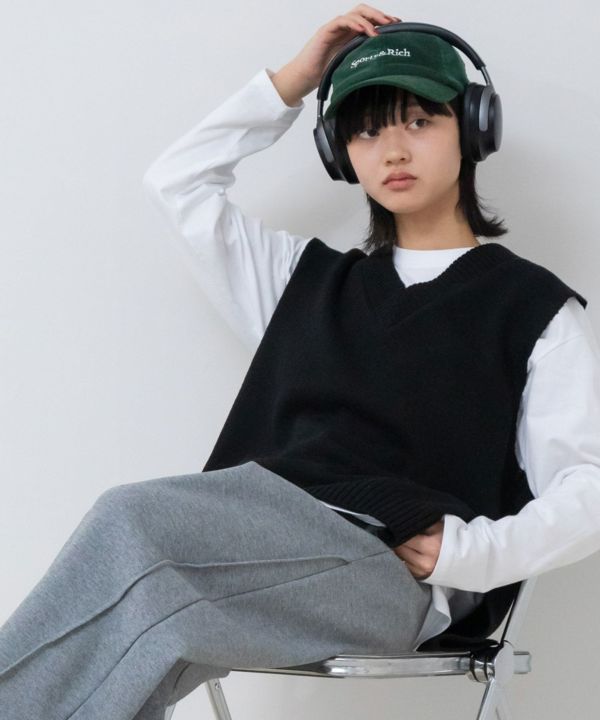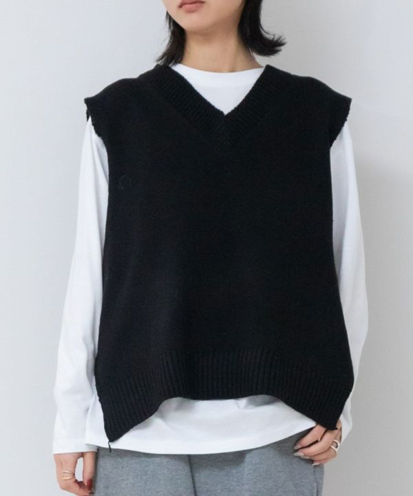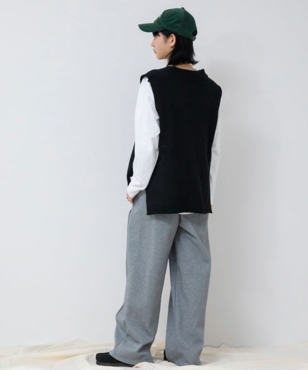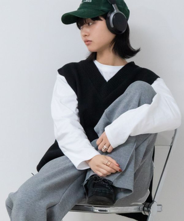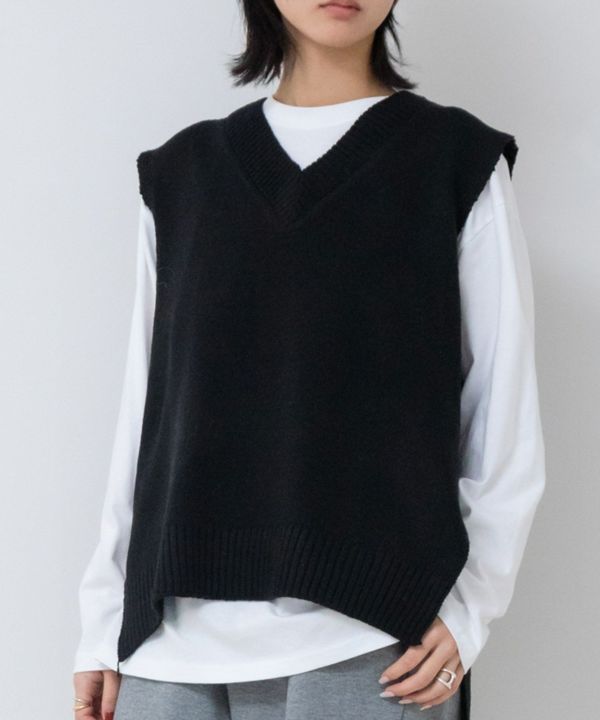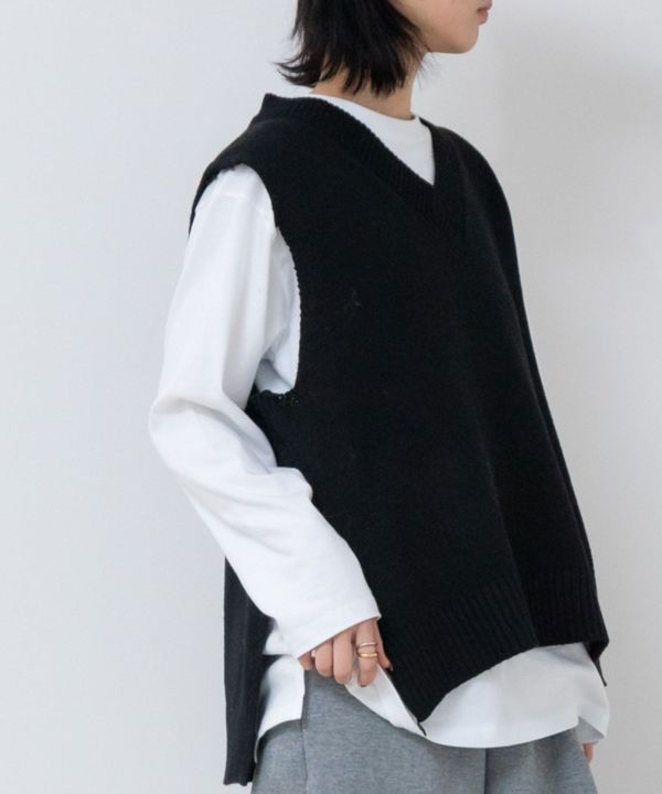 シンプルなデザインながらも深めなサイドスリットが抜け感とこなれ感を演出してくれます。前後差のある裾は前はすっきりとみせ、腰回りをしっかりカバーしてくれます。Vネック部分は太めなリブ仕様で、首元はすっきりした印象に。袖口が広く、袖幅の広いスウェットやシャツにも合わせやすいデザインです。